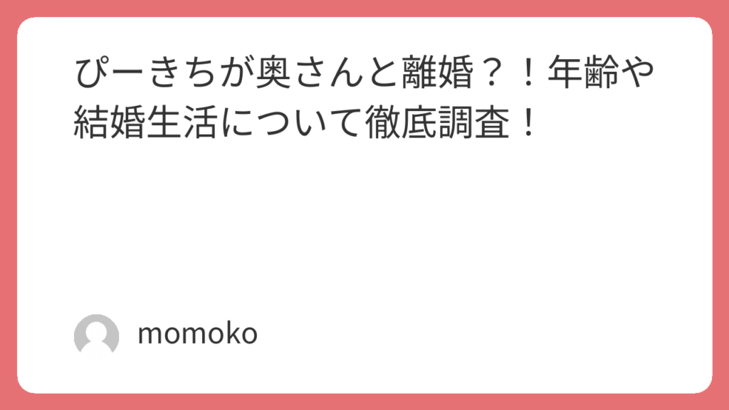 この記事では、「ぴーきち」さんの離婚に関する情報、奥さんや結婚生活について紹介してきました。